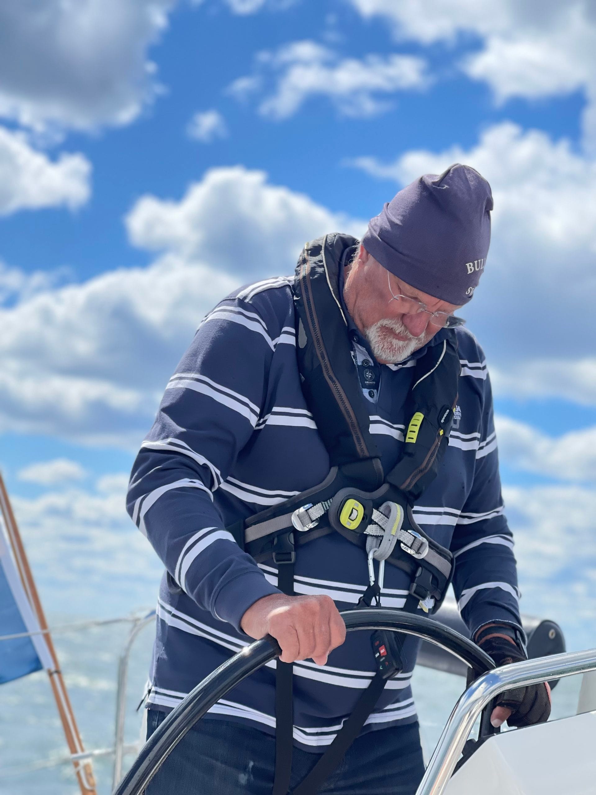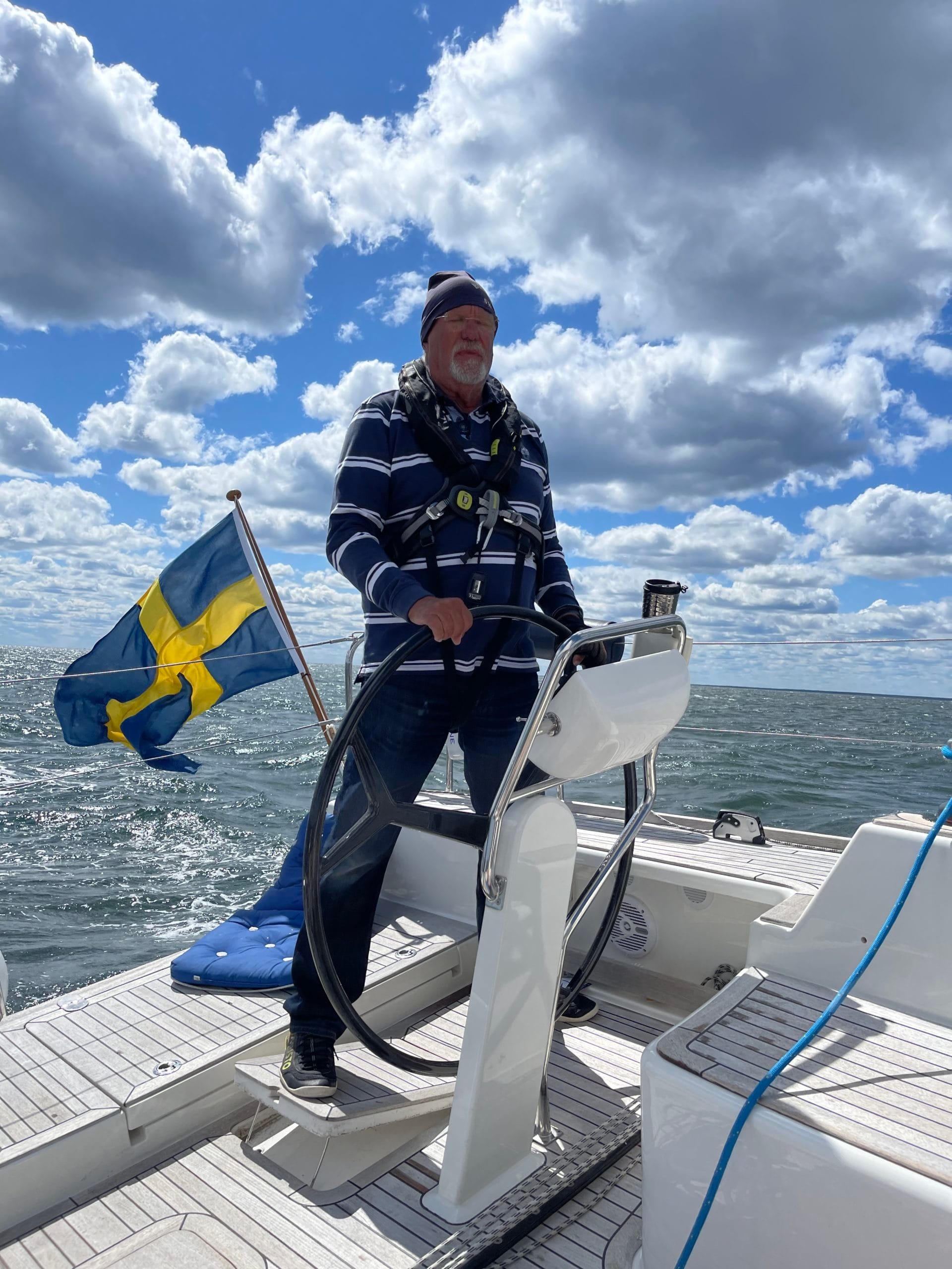 Av bilden framgår inte att det var ganska rejäla vågor snett framifrån och dito vind, så vi hade halvvind…då lutar det en del, men kapten Sundström stod stark de 6 timmarna…efter ytterligare 3 timmar ligger vi nu i fina Västervik. Här öppnades visfestivalen idag så i morgon får vi kolla programmet ????????