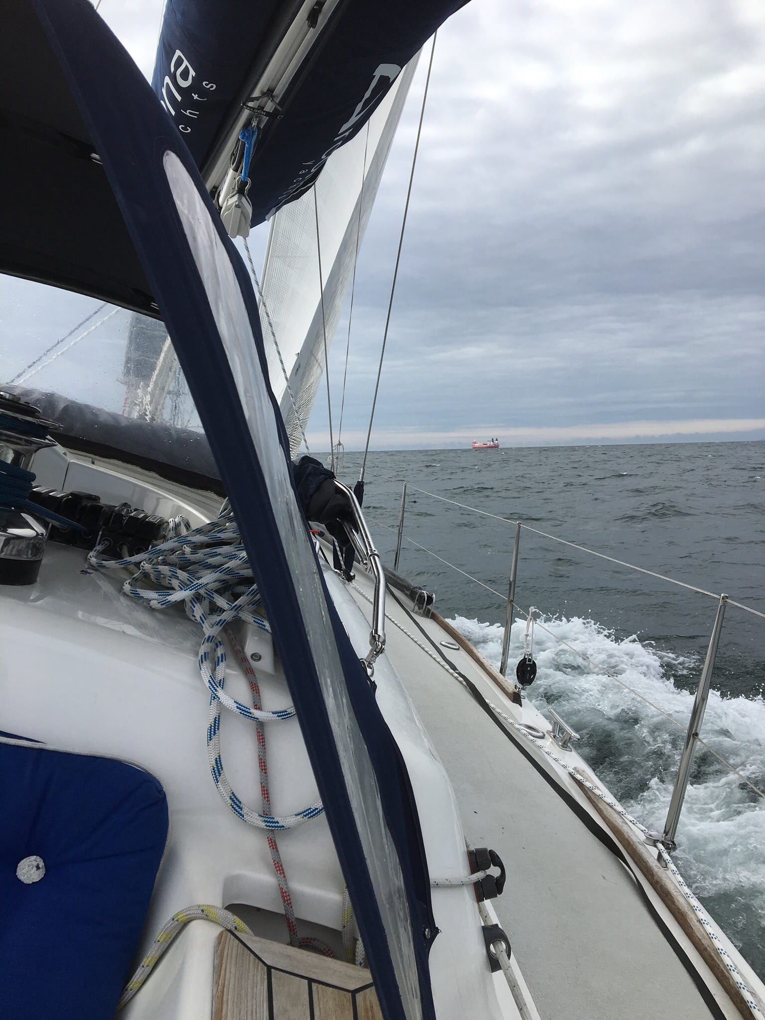 Vi lämnade ett gråmulet Skagen på förmiddagen och fick kryssa i 10 ms motvind söderut mot Laesö, dessutom kraftiga vågor.