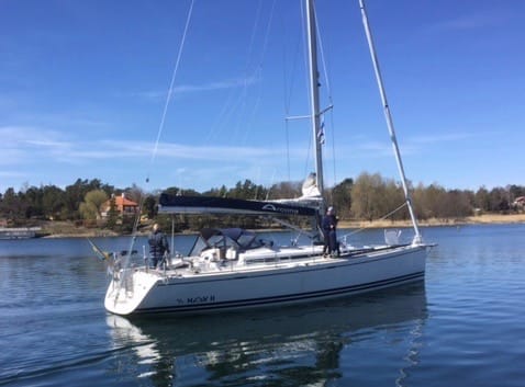 Premiärsegling. I solsken och lätta vindar gick årets första segling till Sandhamn. Vi gick under Djuröbron eftersom det var lågt vattenstånd men VHF antennen slog ändå i med två tydliga "pling". Därefter gick vi upp mot Möja söderfjärd och tillbaka mot Sandhamn för att få känna på lite segling i olika riktningar. Det var kallt i havet och på båten. Efter en middag på Värdshuset och natt i Sandhamn gick vi på söndagen tillbaka till hemmahamnen, Bullandö. Även denna gång två "pling" i Djuröbron.