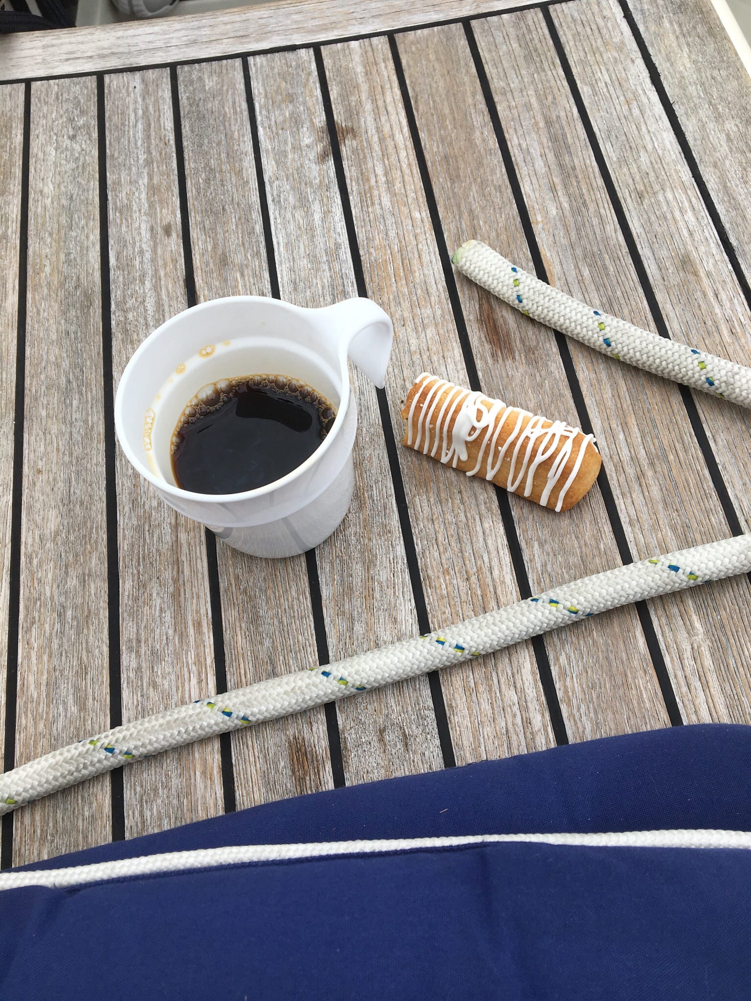 Idag vaknade vi i ett mulet Laesö, dock bra vindar enligt prognosen så vi kastade loss vid niotiden. Idag ska vi ta oss till Anholt, ca 8 timmars segling. Frukost under gång och är man i Danmark måste man ha en liten kransekage till kaffet ????????