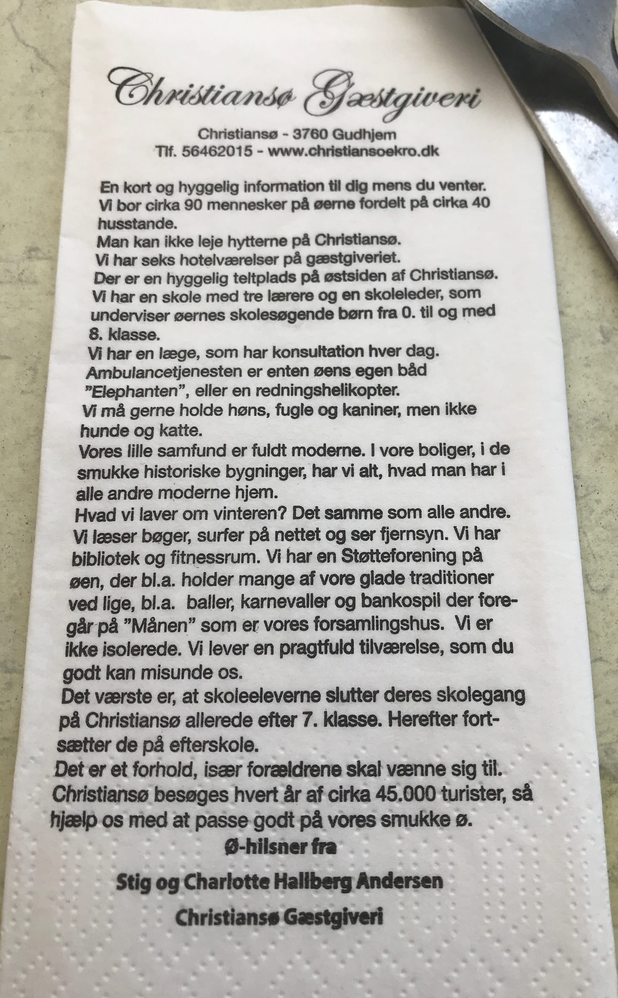 Det här stod på servetterna på värdshuset om ön och dess befolkning.