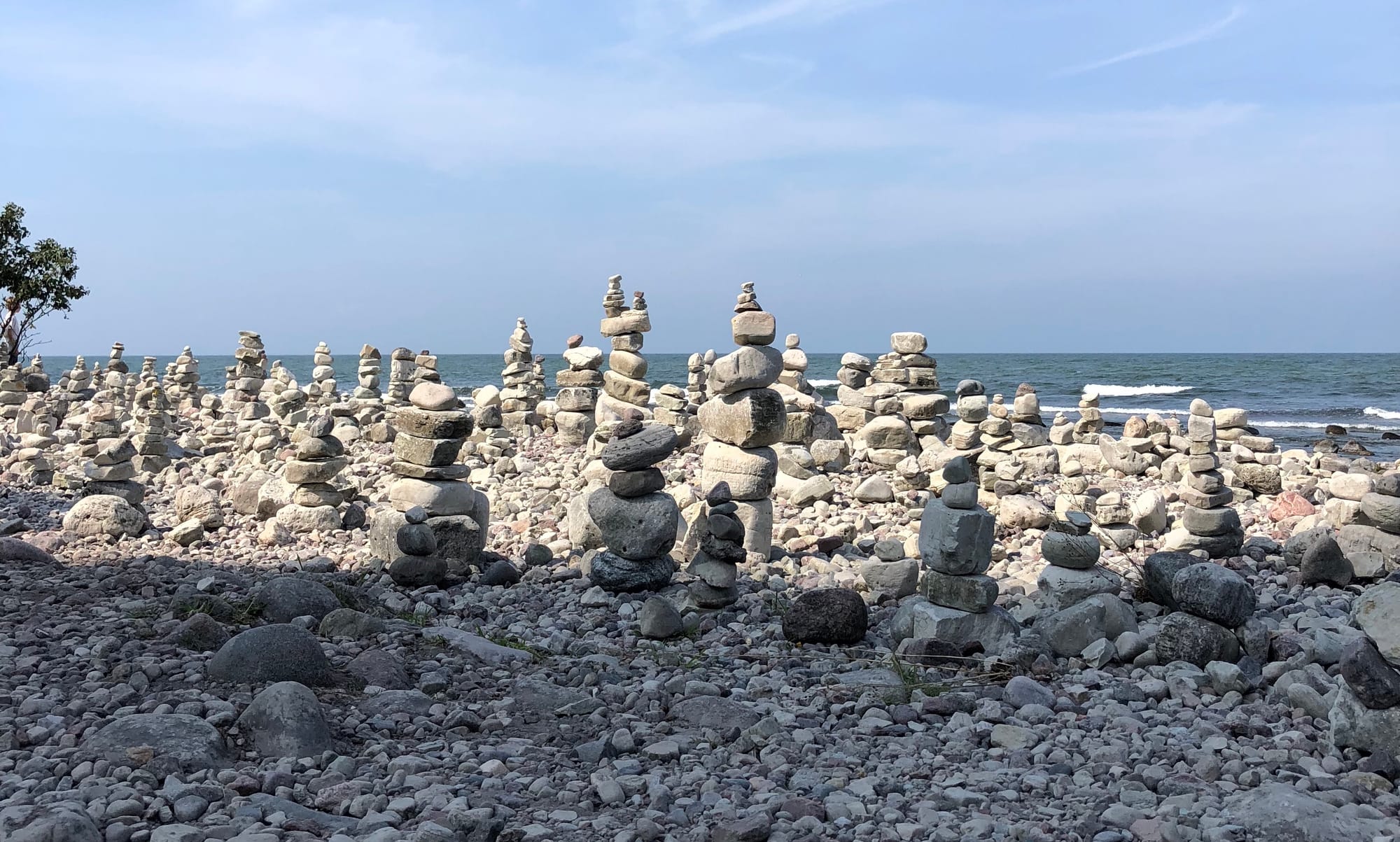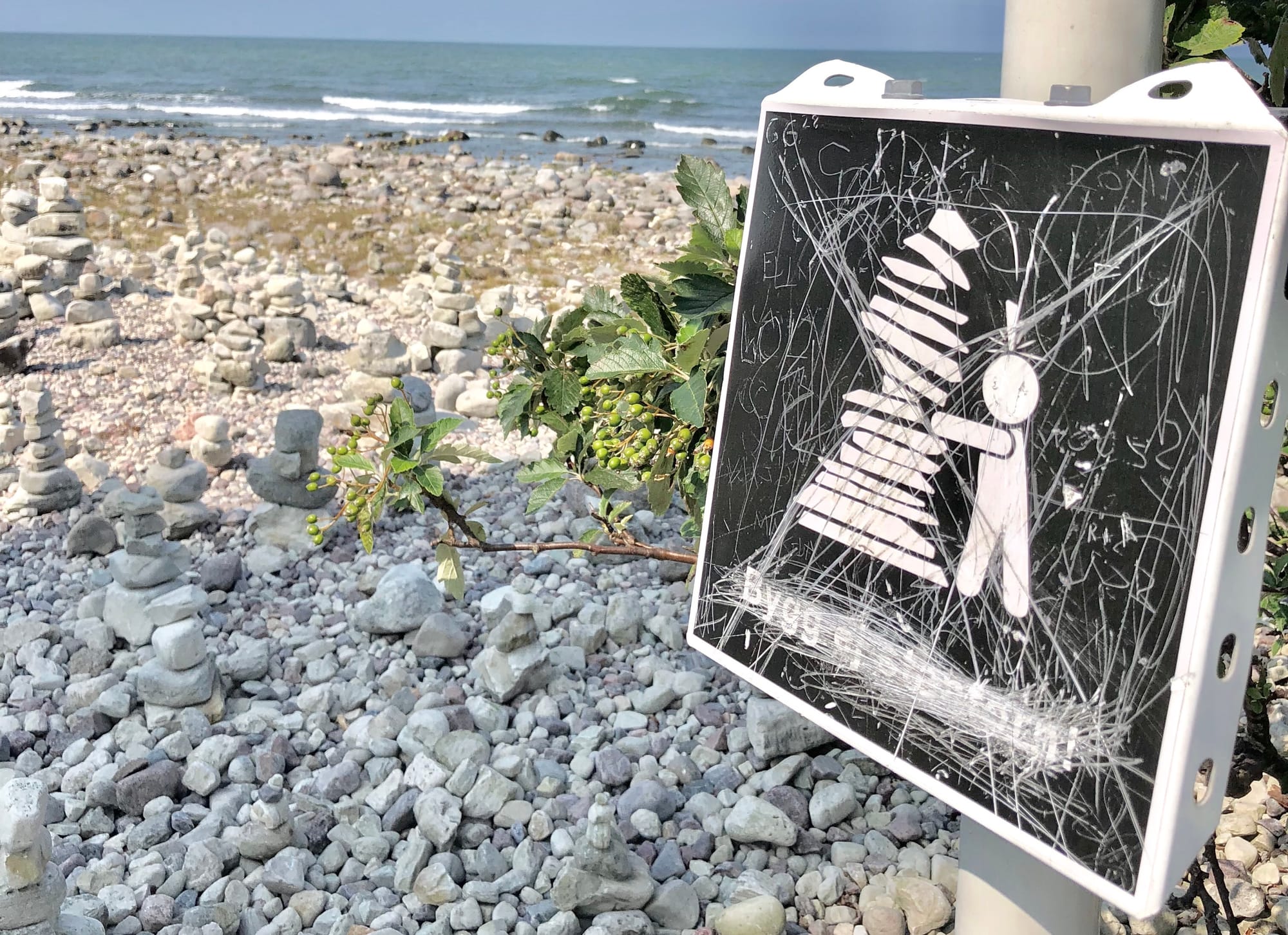 På skylten står "bygg ej stentorn" och stranden är fylld av dessa ????????????