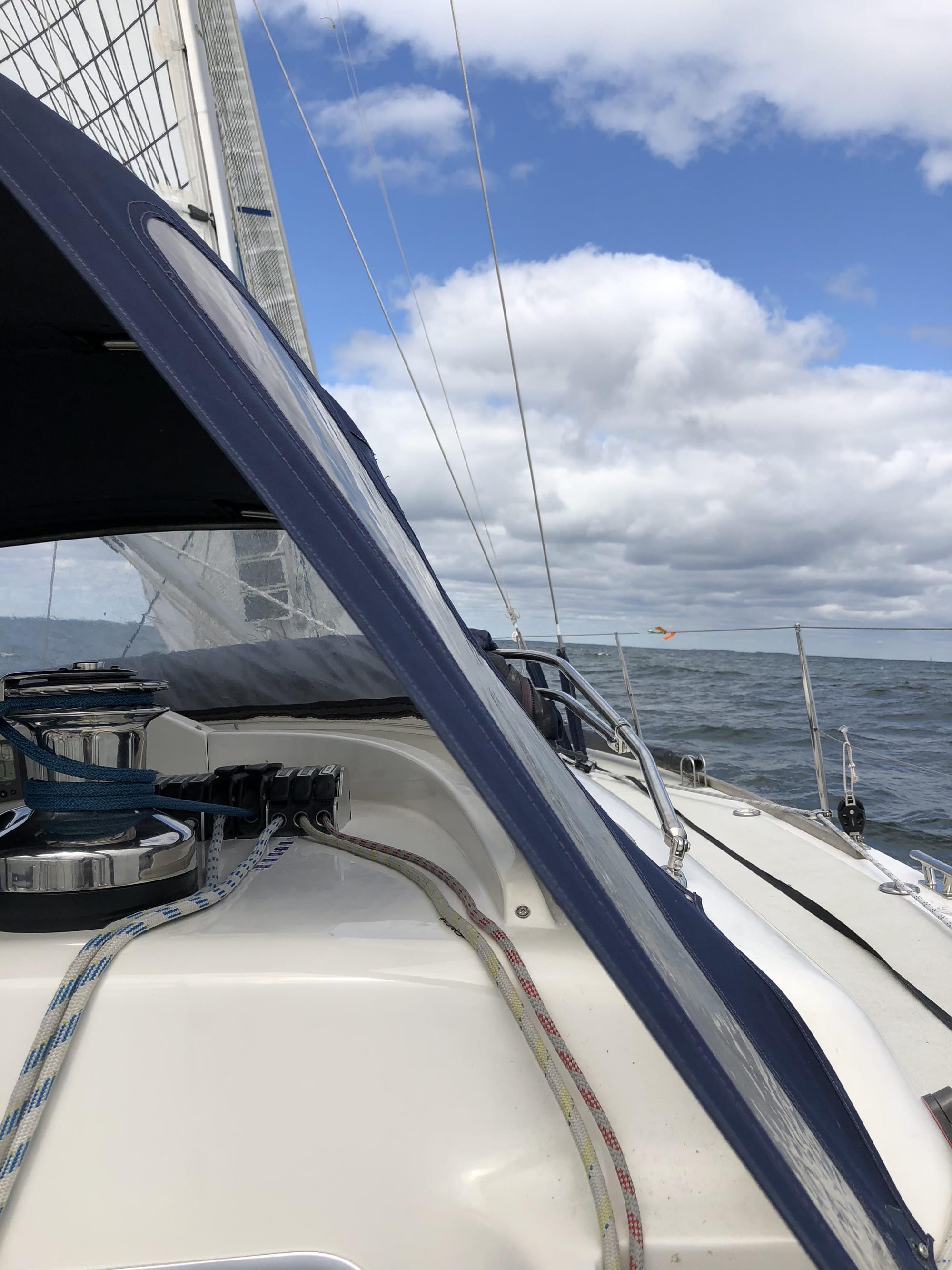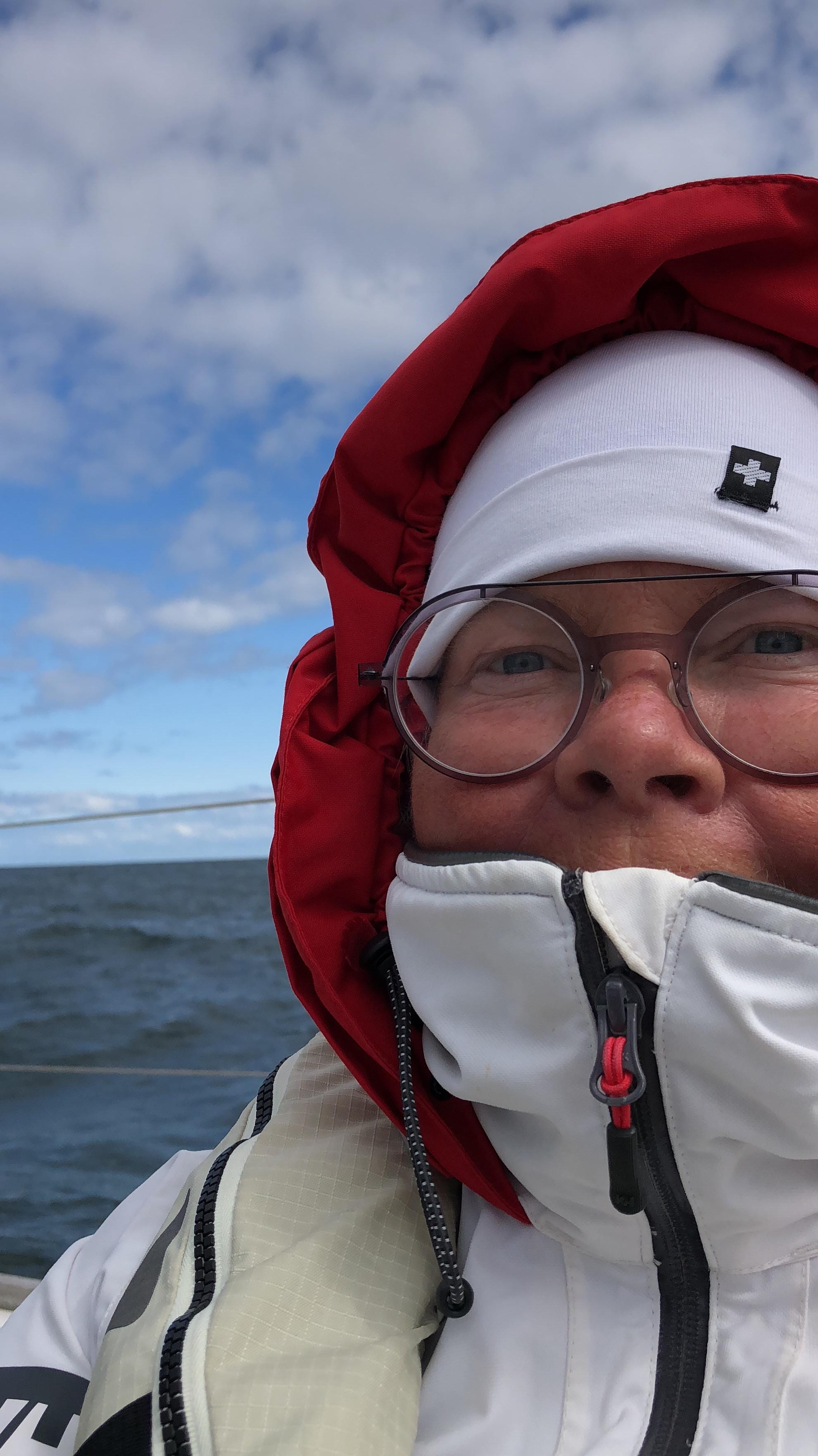 Forfarande lite byigt och vågor men då detta skulle vara avtagande satte vi segel och styrde från Öland.