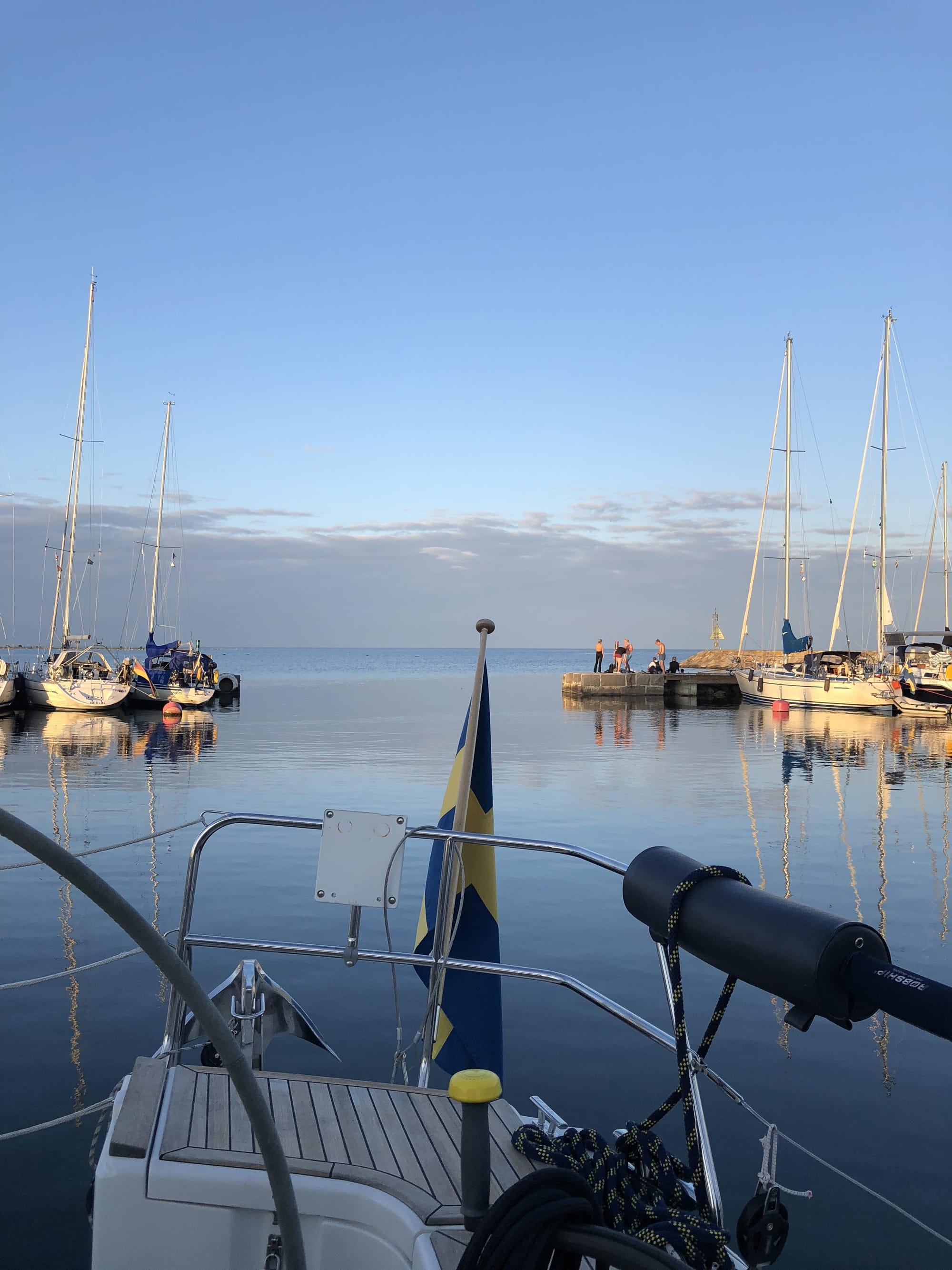 När vi närmar oss hamnen slår vi hamnkapten en signal då det redan ligger en stor motorbåt på vår plats, han kommer oss till mötes och säger att vi kan ligga utanpå dem eller för boj. Kapten T ifrågasätter hur man kan boka men sen inte få platsen...tillslut pekar hamnkapten ut mot havet igen ???????? trevligt bemötande!