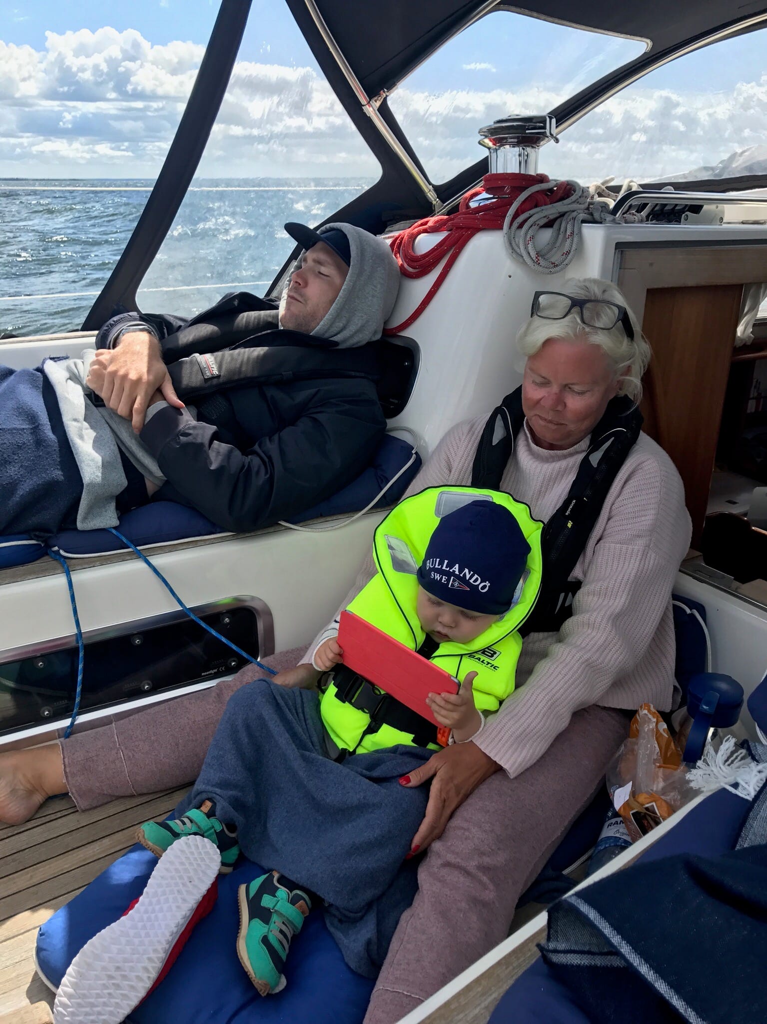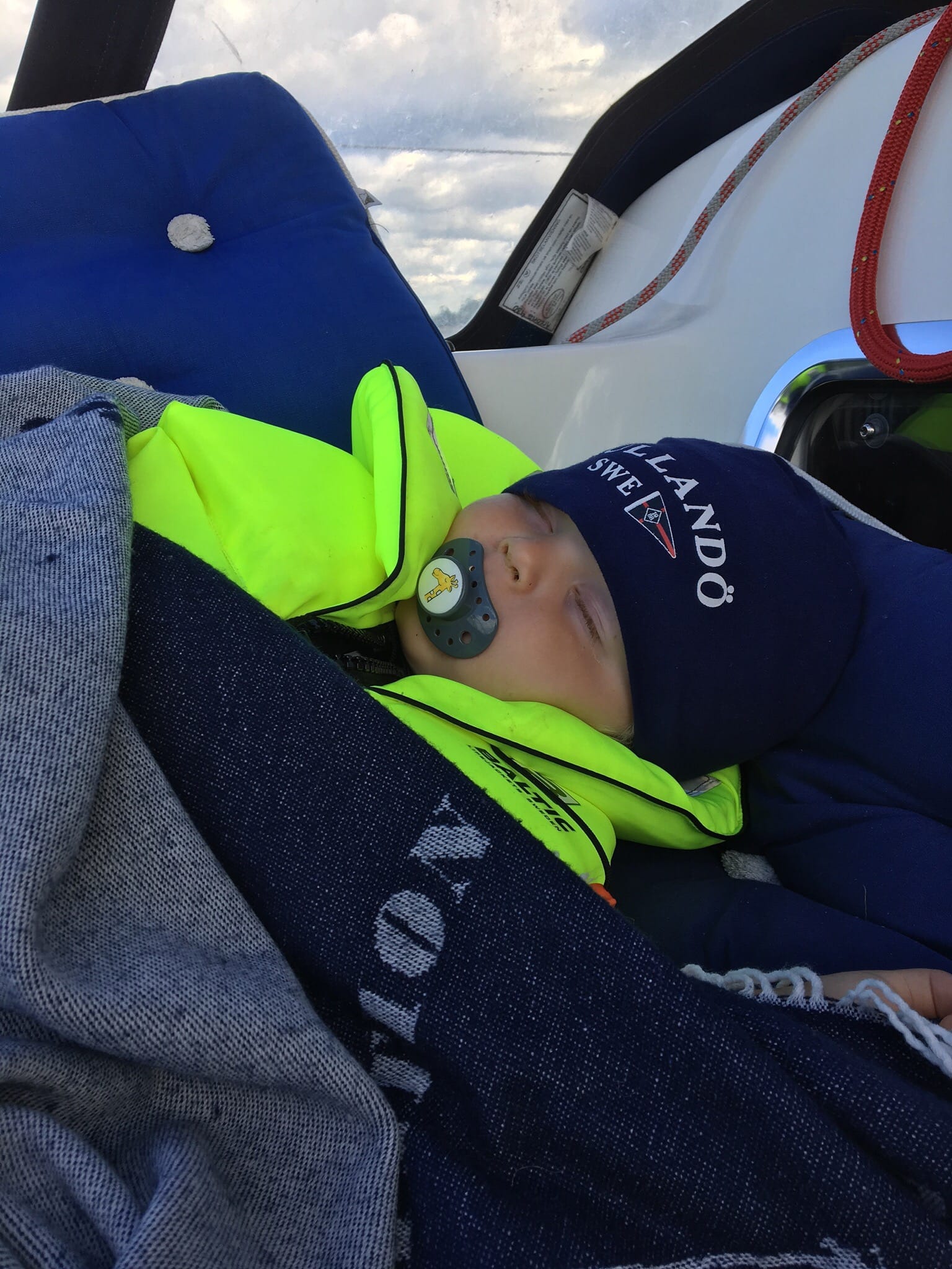 Delar av besättningen blev sjösjuka ???????? men Bosse mådde finfint och höll humöret uppe trots att han inte kunde promenera alls under dagen utan fick sitta eller ligga på däck. Duktigt att sova i flytväst på däck...farmor är imponerad ????????