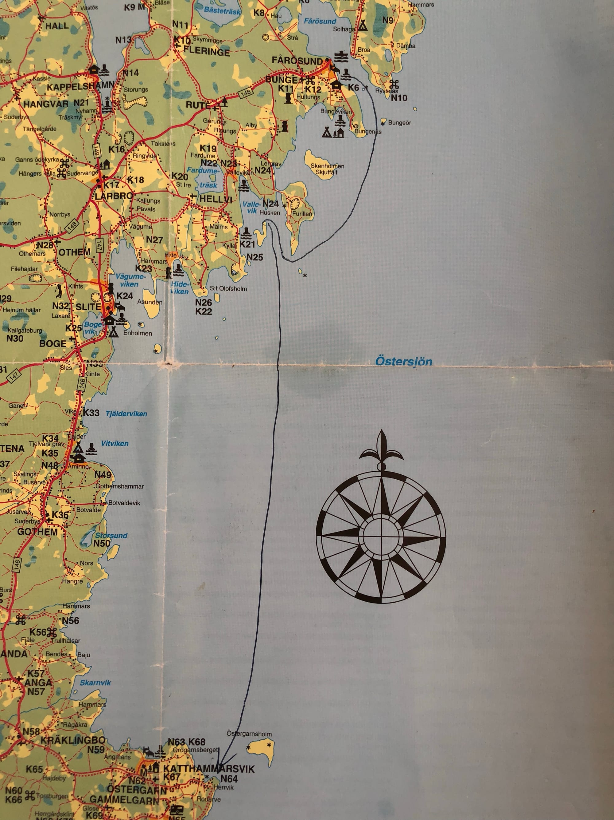 När vi kom in i hamnen syntes inte så mycket som en roddbåt i inloppet, jag ringer igen...-Nej jag ser er inte. -Men vi är ju här i hamnen! -I Visby? -??? På nätet fanns det här numret och på nåt sätt samarbetar vissa hamnar, men det kan ju bli rätt knasigt. Nåväl nu ligger vi här i den fortfarande fungerande fiskehamnen, en av två gästbåtar.