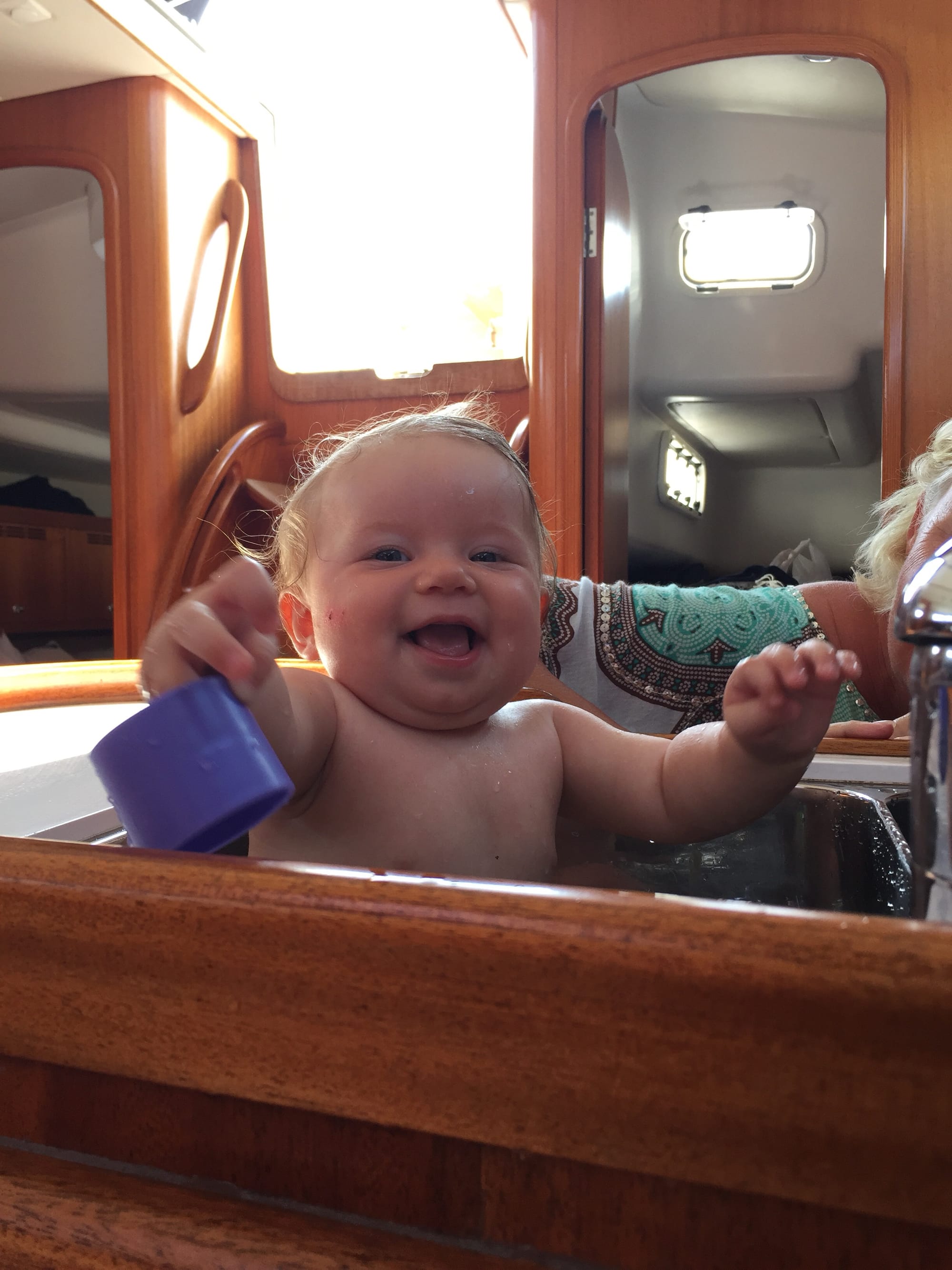 Charlie fick ta det sedvanliga badet i diskhon som alla lagom stora människor får göra när de seglar med oss, det uppskattades!