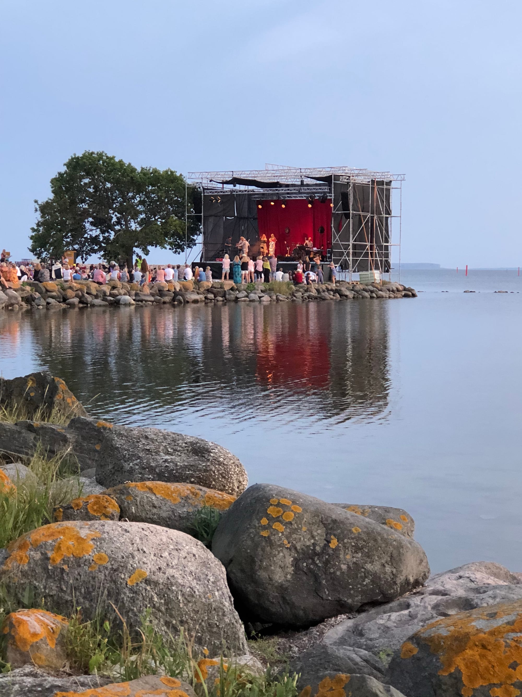 I Klintehamns hamn fastnade på grund, ringde hamnvakten som kom ut med sin lilla motorbåt- Jaha ni hamnade på sandbanken, jag har tänkt sätta upp nåt där för att markera den. Nåja, han kunde dra loss oss efter en liten stund, nu har vi lagt till ytterst i hamnen. Rakt över sundet finns en stor scen och efter lite googlande hittade vi att det är ett pensionat där som har musikvecka. Ikväll var det tribute till Ted och med gästartist Shirley Clamp. Vi cyklade dit och fick en härlig kväll.