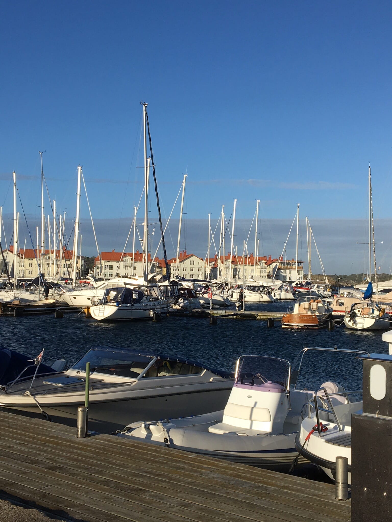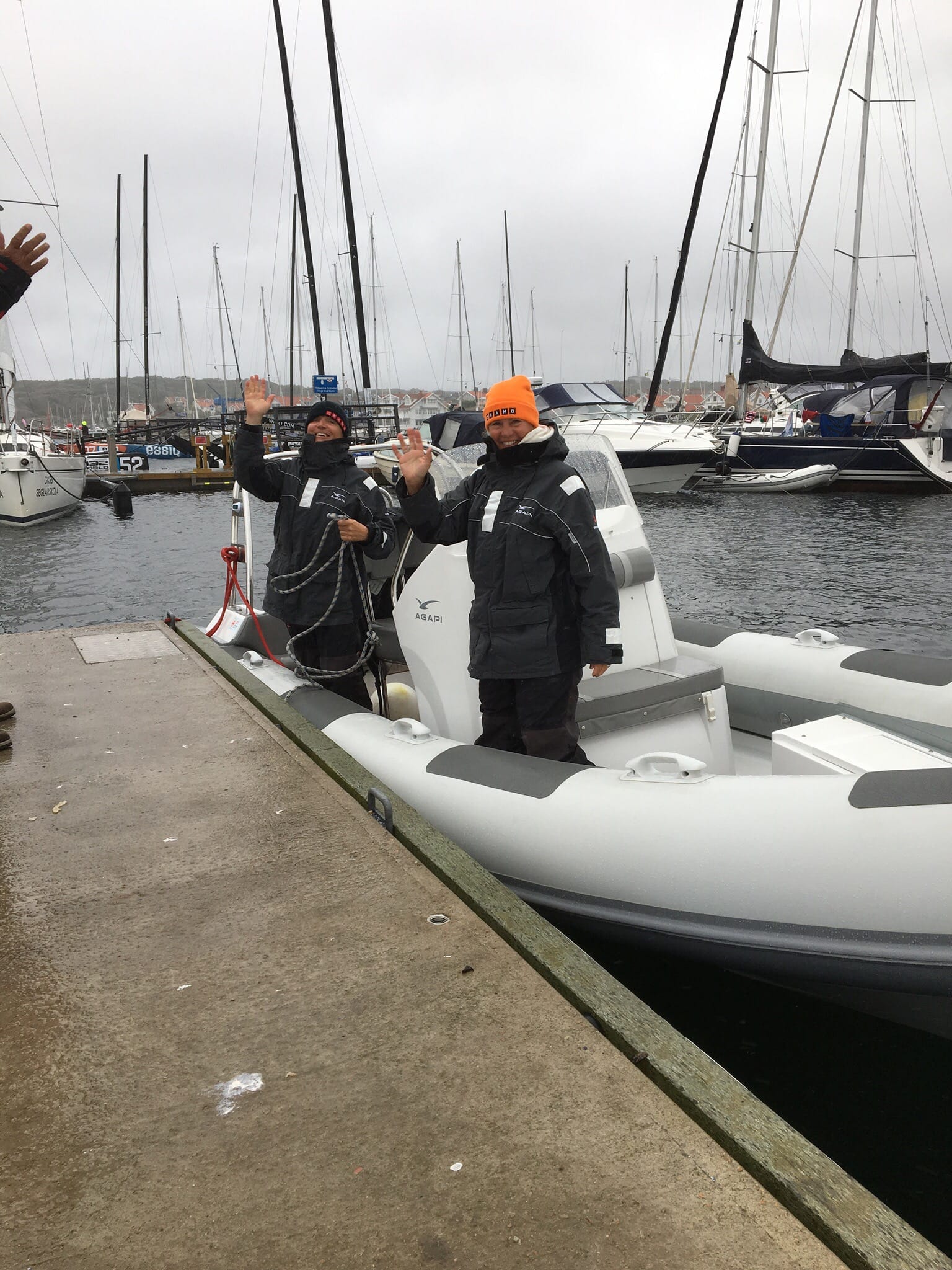 Idag ösregnade det och blåste hårt när vi vaknade i Marstrand ???????? vi var förberedda via sjörapporten och det finns sämre platser att vara inblåsta på. På förmiddagen kom Lella och Per traskandes från sitt hotell för att ta ribben till fastlandet i ovädret.