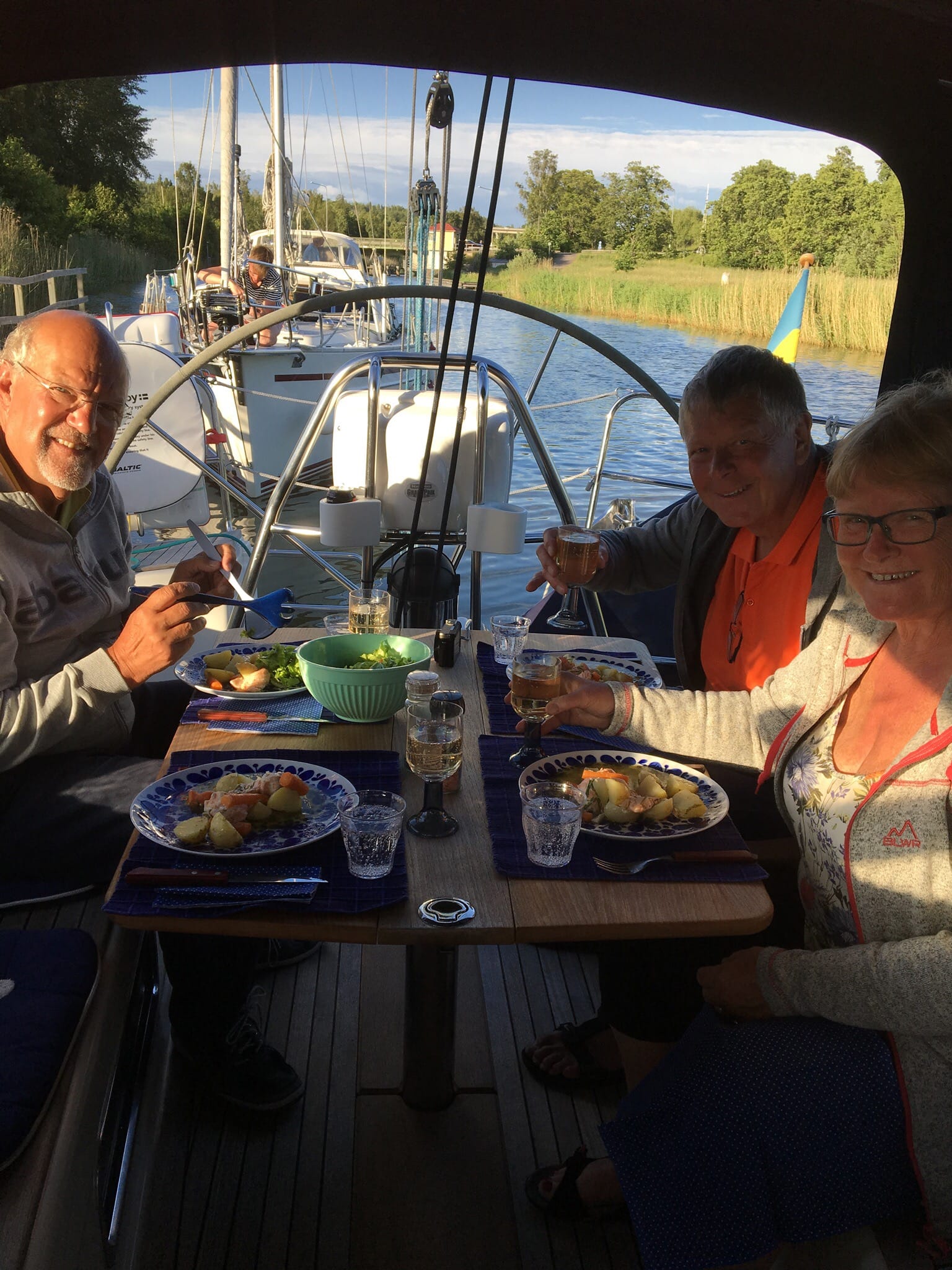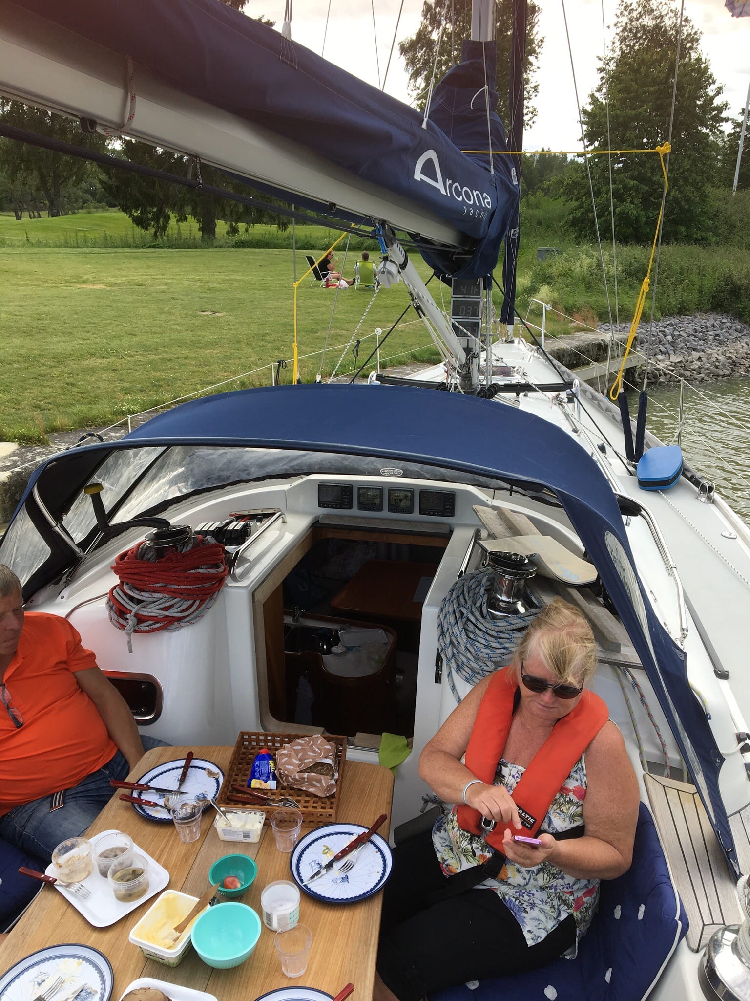 En bit innan Asplången tyckte vi det var dags för lunch och började lägga till vid en för ändamålet avsedd stenkaj och.....vi sitter fast...i gyttja...vi provade olika sätt att dra oss loss men icke! Vad gör vi? Vi tog fram lunchen och åt ????
